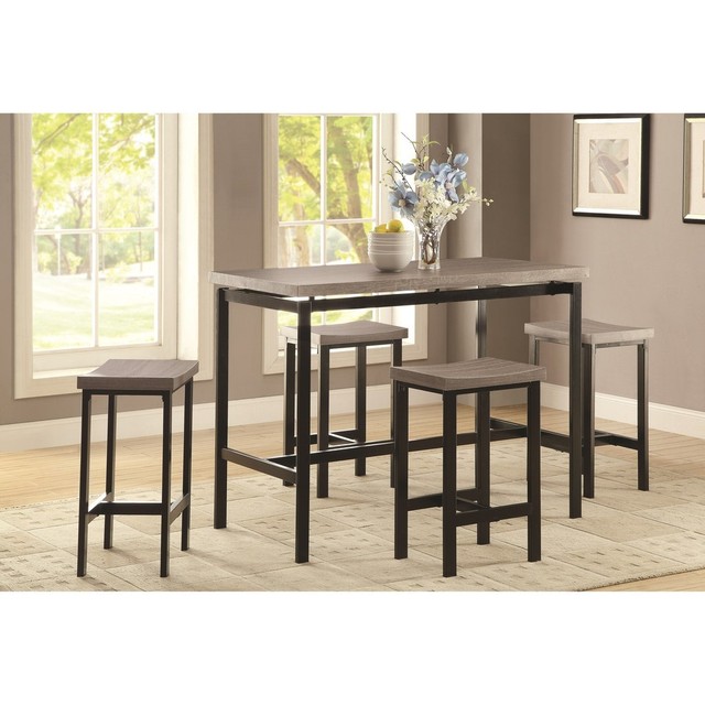 Dining set seats 4 people. 1499 5 piece dining set includes counter height table and 4 backless stools. Steel frame in matte black with floating tabletop. Made from durable wood, the set includes two sturdy chairs and compact table with smooth top.