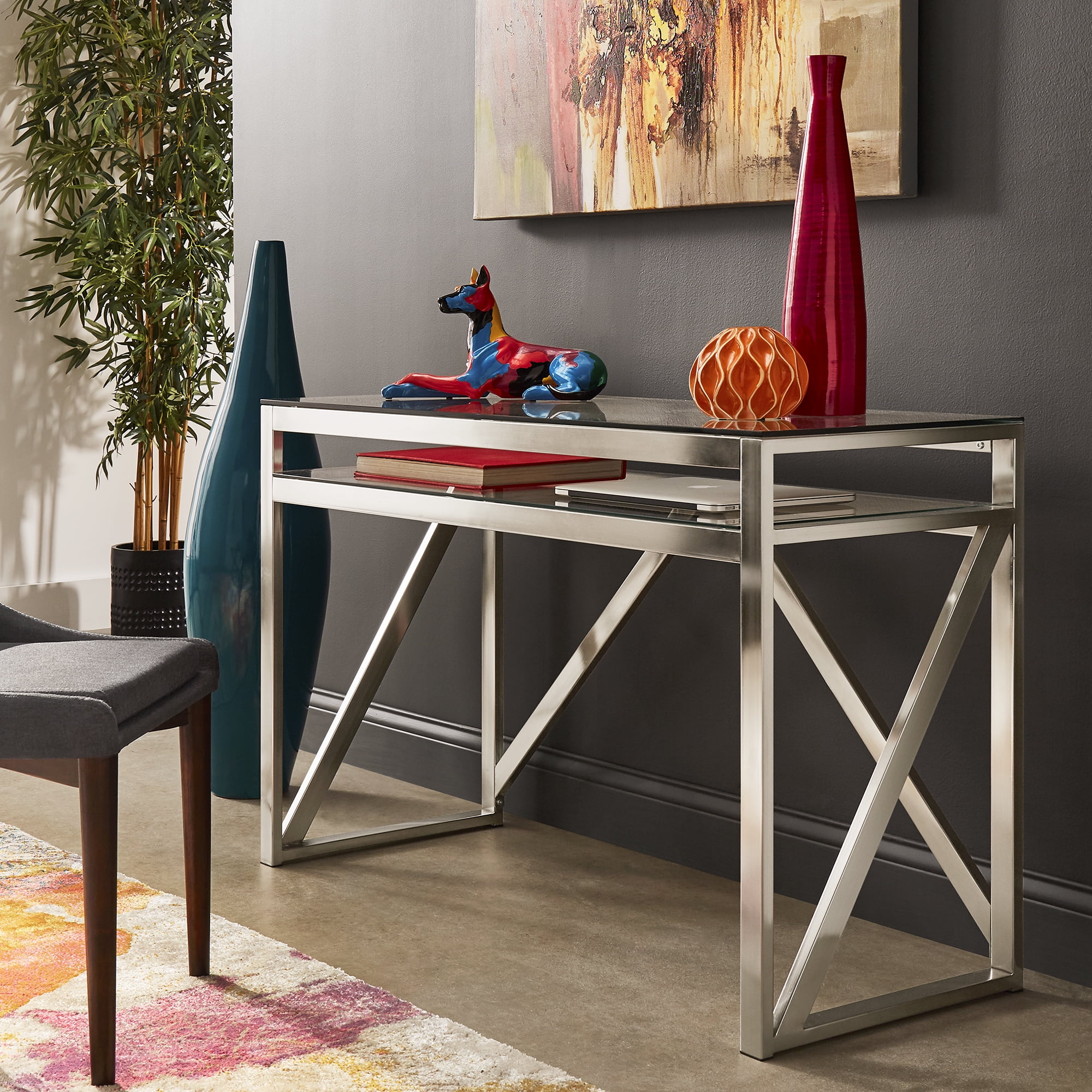 $45.00 new brushed metallic console table with display for sale in west valley city, ut on ksl classifieds. The hoffman metal console table's slender silhouette is finished in brushed gold for a touch of gleam. Decmode modern iron and acrylic rectangular mirror console table. The palisade console table glimmers with metal and the sheen of glass, inviting light into your space.