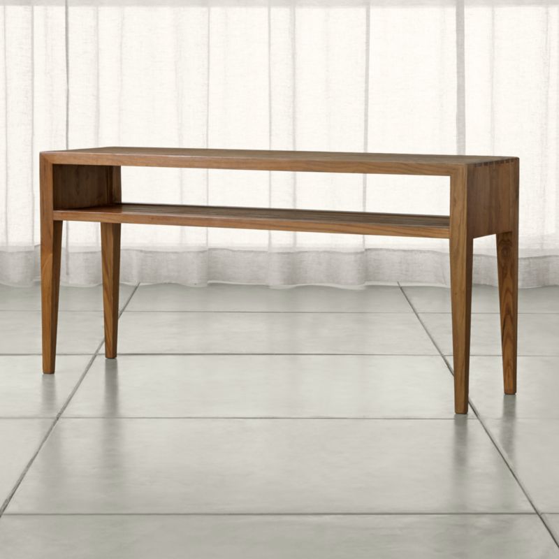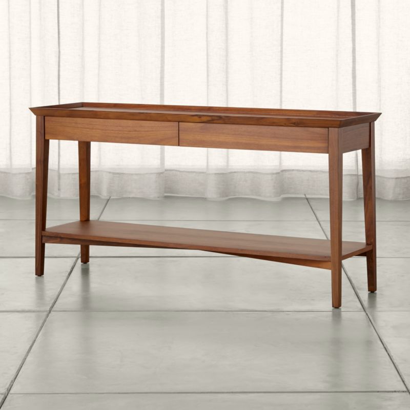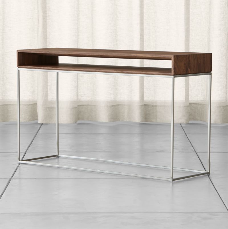 Crate And Barrel Console Table. The console table's angled iron legs, finished in matte antique black, lend a modern, minimalist feel to the rustic wood top. A console table, also called a sofa table, brings beauty and practicality in many more locations than simply behind a sofa. Add convenient surface area in any room of your home using entryway tables and console tables.