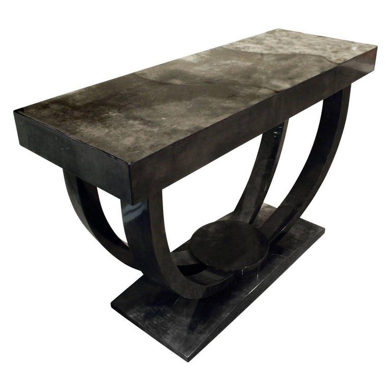 Designed in the 1970s in the style of karl springer/ pierre cardin, this sculptural cantilevered table is as much a piece of art as it is a console, sofa, entry, foyer or hall table. This is a wonderful example of springer's meticulous craftsmansh. Who's ready for outdoor entertaining? Karl springer art deco console table in lacquered goat skin, 1970s.