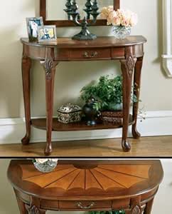 Rated 4.5 out of 5 stars. Mahogany half moon wood console table with storage. The collection is done in select cathedral oak wire brushed veneers in a mushroom oak finish. Shabby chic cottage antique sage green mission/shaker console table.