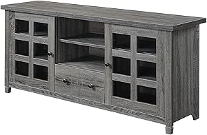 Weathered Gray Tv Stand. The weathered gray finish and antique black hardware adorn this tv stand's breakfront profile, plinth base and attractive lattice mullions. Accommodating your flat screen tv up to 80″ and 155 lbs., this tv stand also includes two drawers and two side cabinets with adjustable shelves. High tv stand features this 54 in.